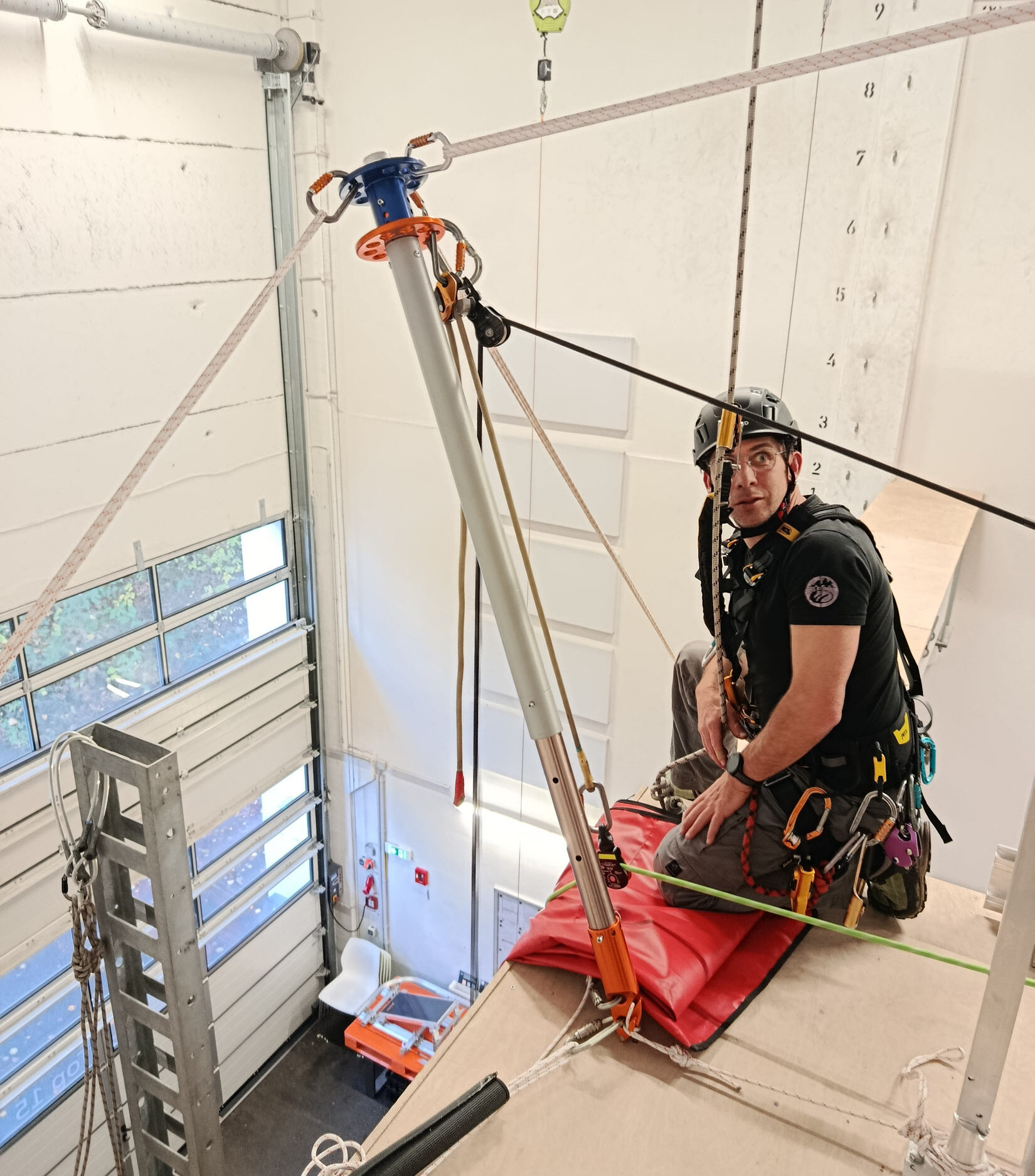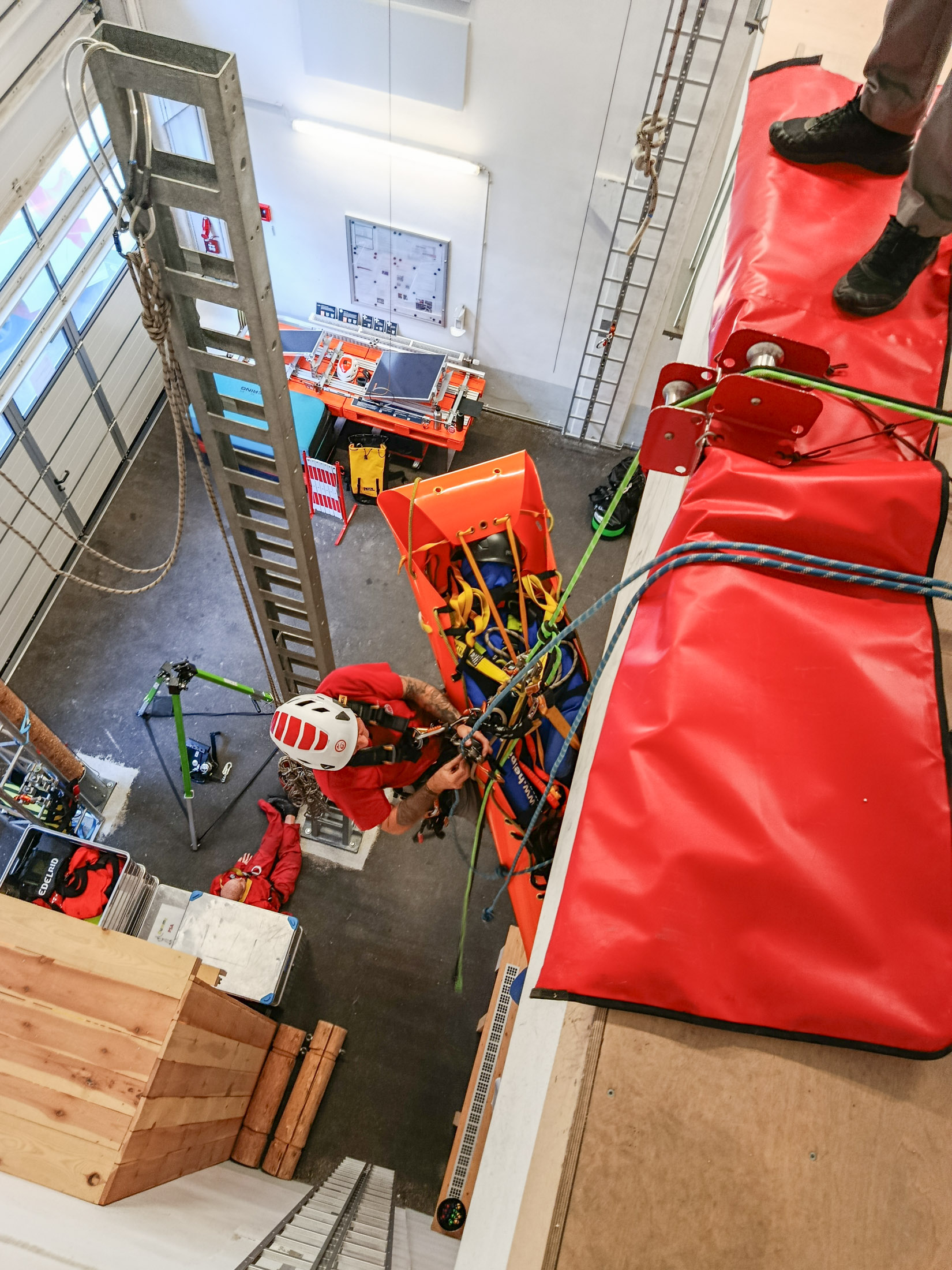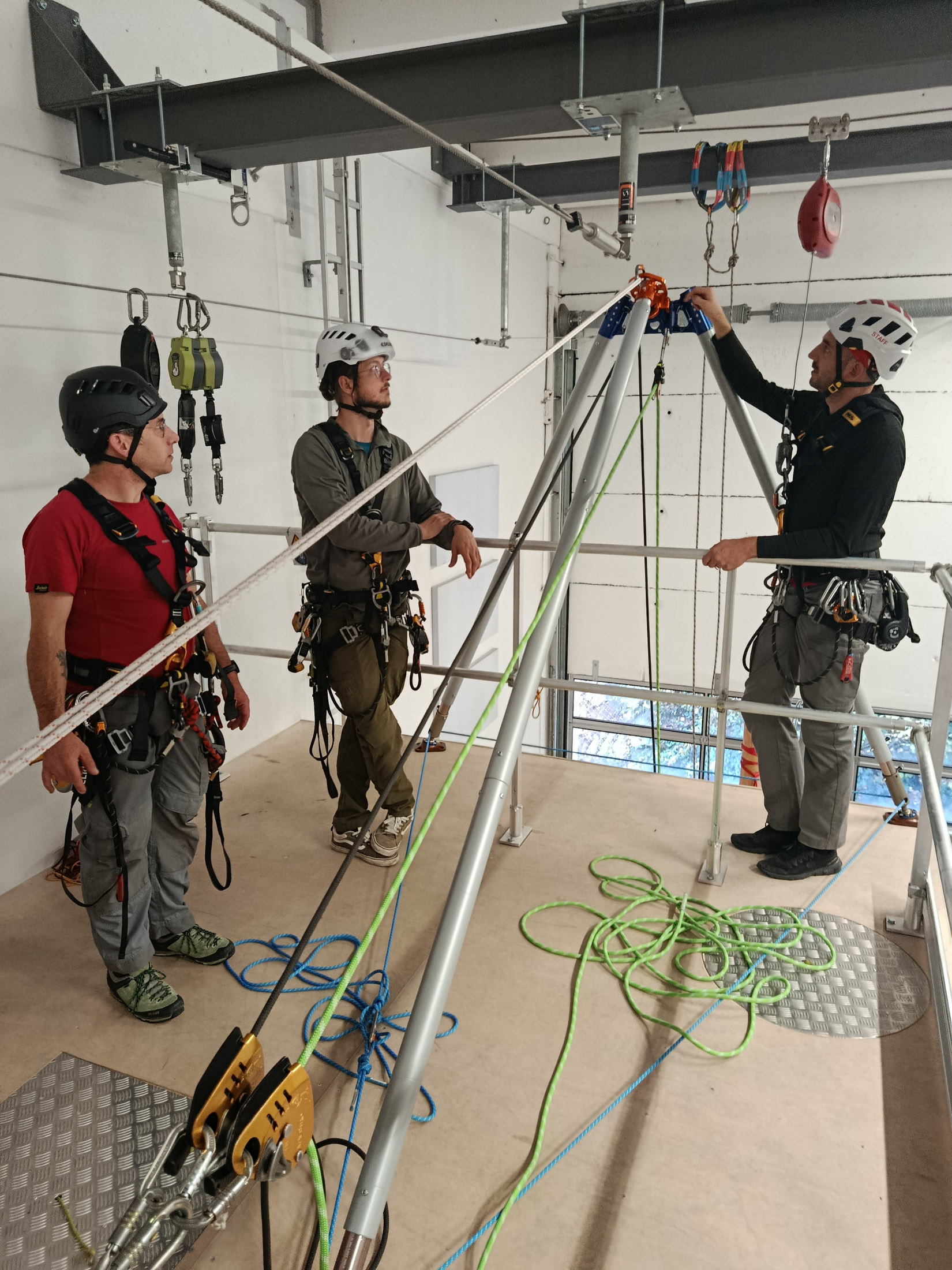 - Level 2: Sicherer Umgang mit Rettungsgeräten in vertikaler Umgebung. Erweiterte Flaschenzüge, das Tragen-Handling in der Vertikalen, Seilmanöver wie Knoten passieren und Kantenüberstieg, als auch passive Seilsysteme mit Richtungswechsel sowie die Aufnahme einer ungesicherten Person sind Teil der Ausbildung. Außerdem wird Basiswissen des 2-/3-Bein gelehrt und der Kantenüberstieg mit Trage geübt. Die Schwerpunkte sind teamorientierte, vertikale Rettungsfähigkeiten zu erlernen.